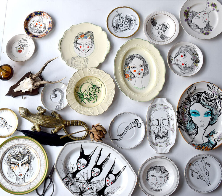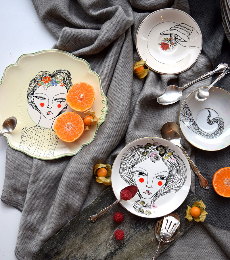 Private home paintings and public murals are something Gurdish has been doing since the beginning of her career, and the same goes for her artwork on dishes. She describes the latter as a recycling project since the plates she uses are found at antique stores or markets. She works with the motif that’s present by incorporating what’s already there into the details she creates. “I let the plate dictate the drawing.” They’re all individual, and she calls the process meditative – a stark contrast to how she describes painting murals. Her large-scale pieces have a different energy to them and working can feel “a bit like dancing.” She always listens to music while she paints and allows herself to loosen up. “You can be much more expressive with your mark making.”